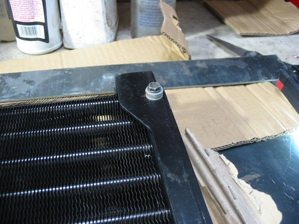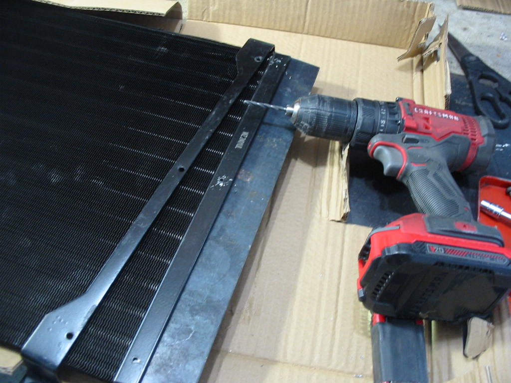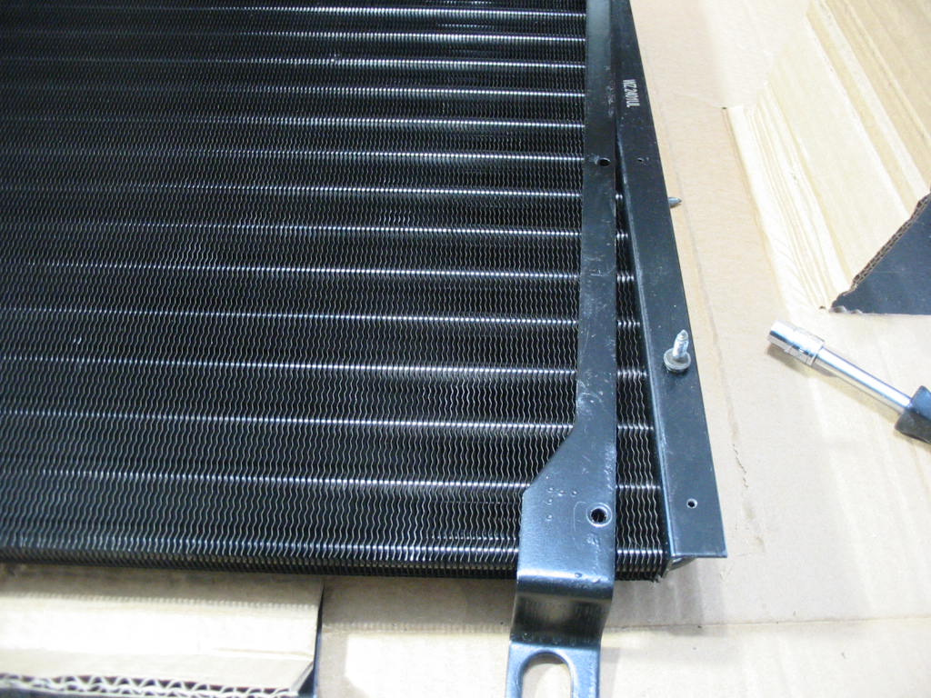 I put a piece of flat bar stock under the bracket to keep from drilling into the condenser tubes and opened up all the holes on the left side. It looks like the screws will go in fine missing all the tubes.