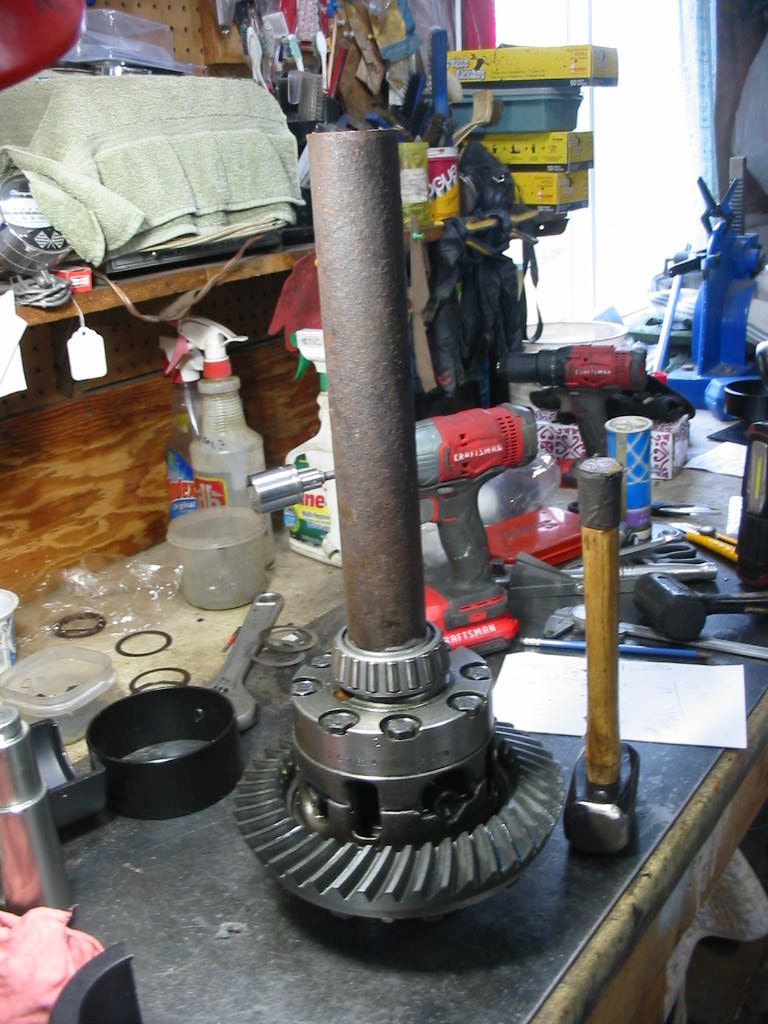 Posi unit and pinion out. So now I have a used 3.55 ring and pinion set for someone. I have the proper bearing remover so the bearings can all be reused.