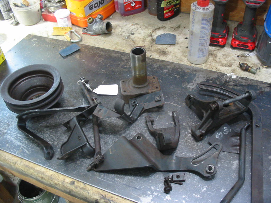 Lots of brackets and parts to clean an paint before the install of the donor engine. I won’t be using the pulley as I’ll need to use the three groove pulley that is on the original engine so I can run the AC belt.