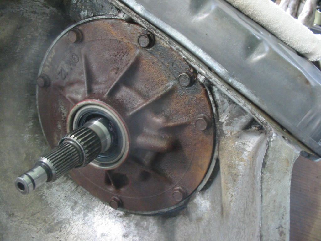 The new seal in place. The front plate is still leaking out a bit of oil. There was a lot of oil and gunk in the trans lower front cover and so I can expect some leakage. It shouldn’t matter for the short time the engine/trans will be in use.
