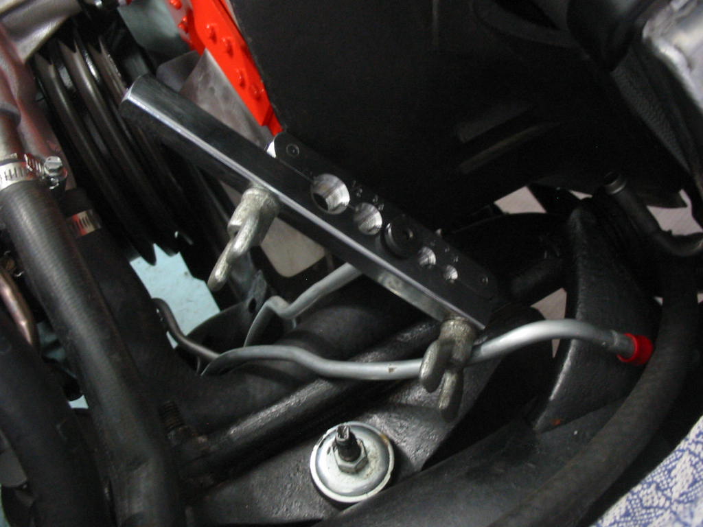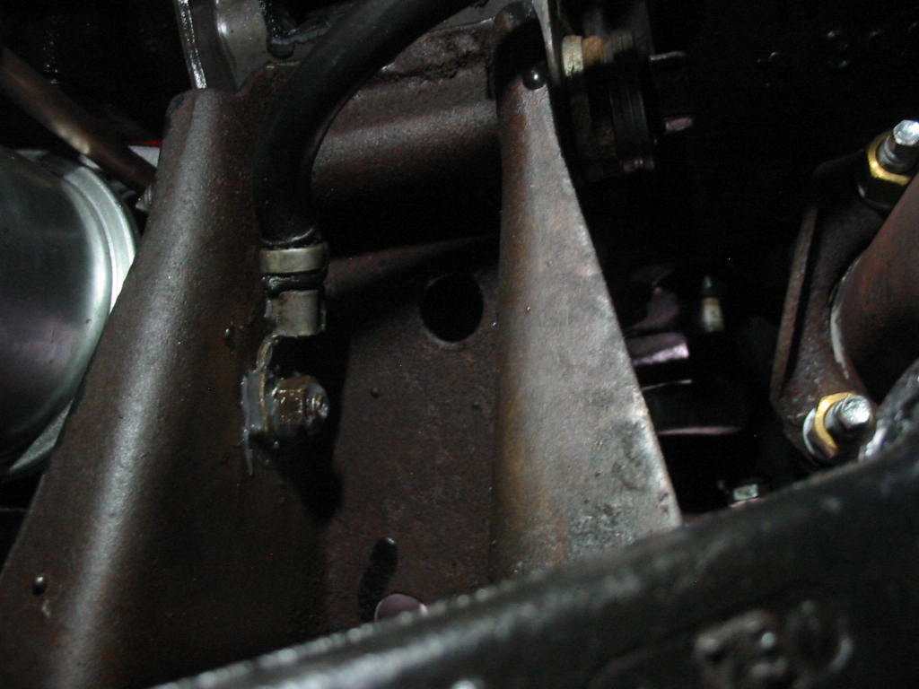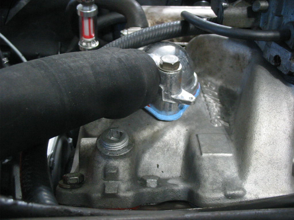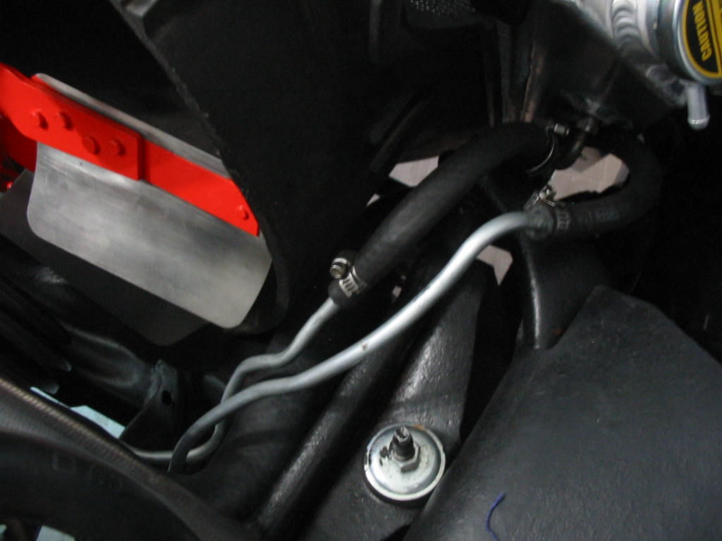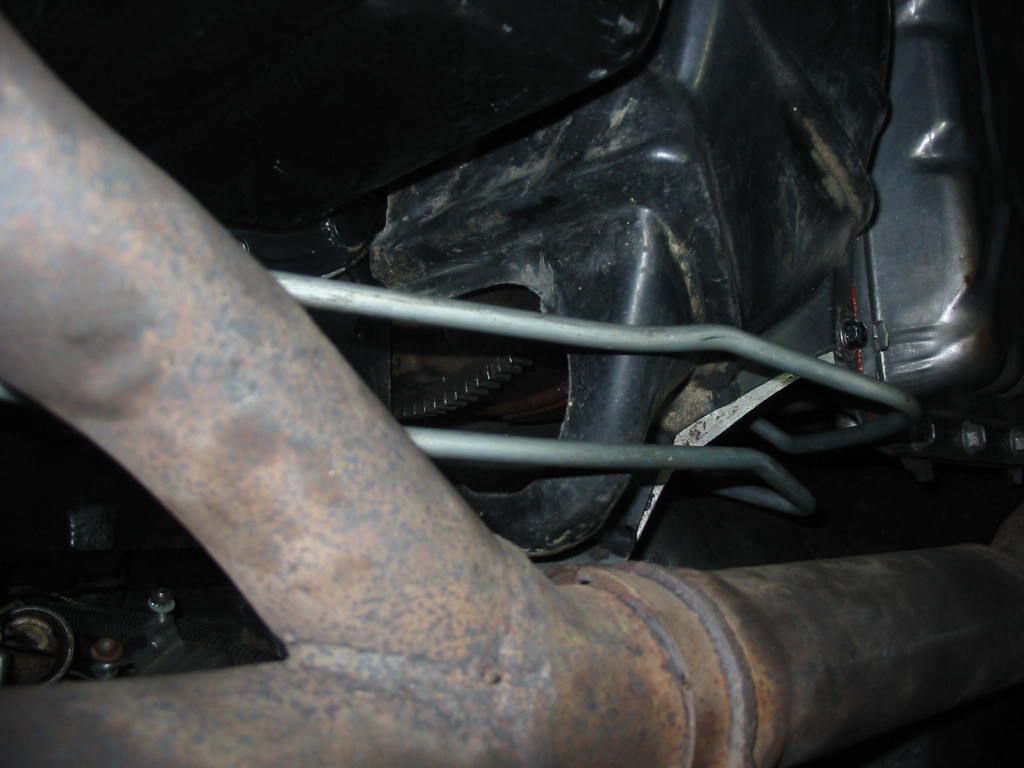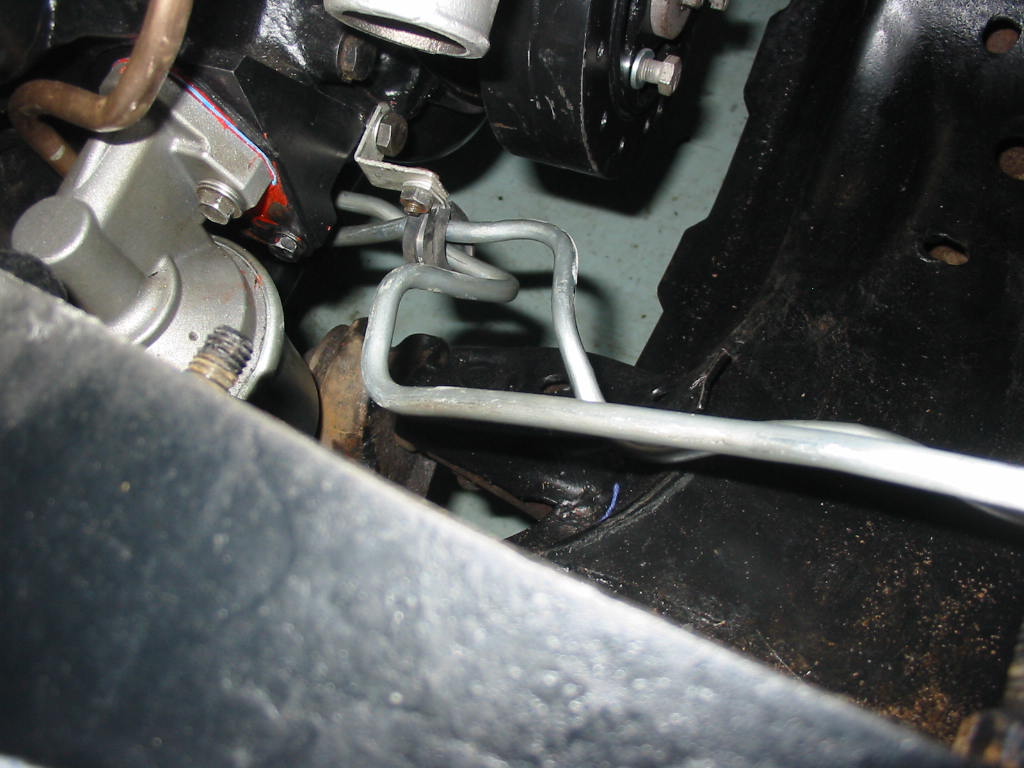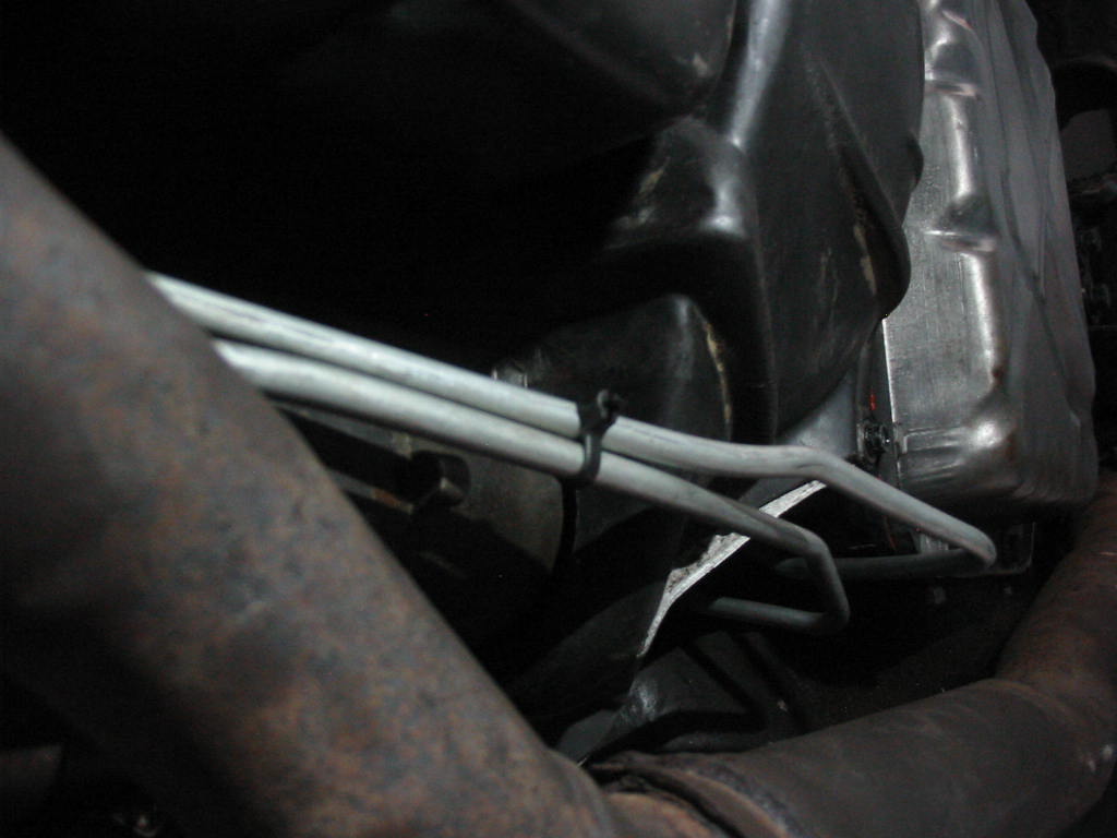The original Chevy motor has a special clip welded to the pan that holds the trans lines. There was none on the 305 So I used a couple of cable ties and a generic bracket to keep them steady.