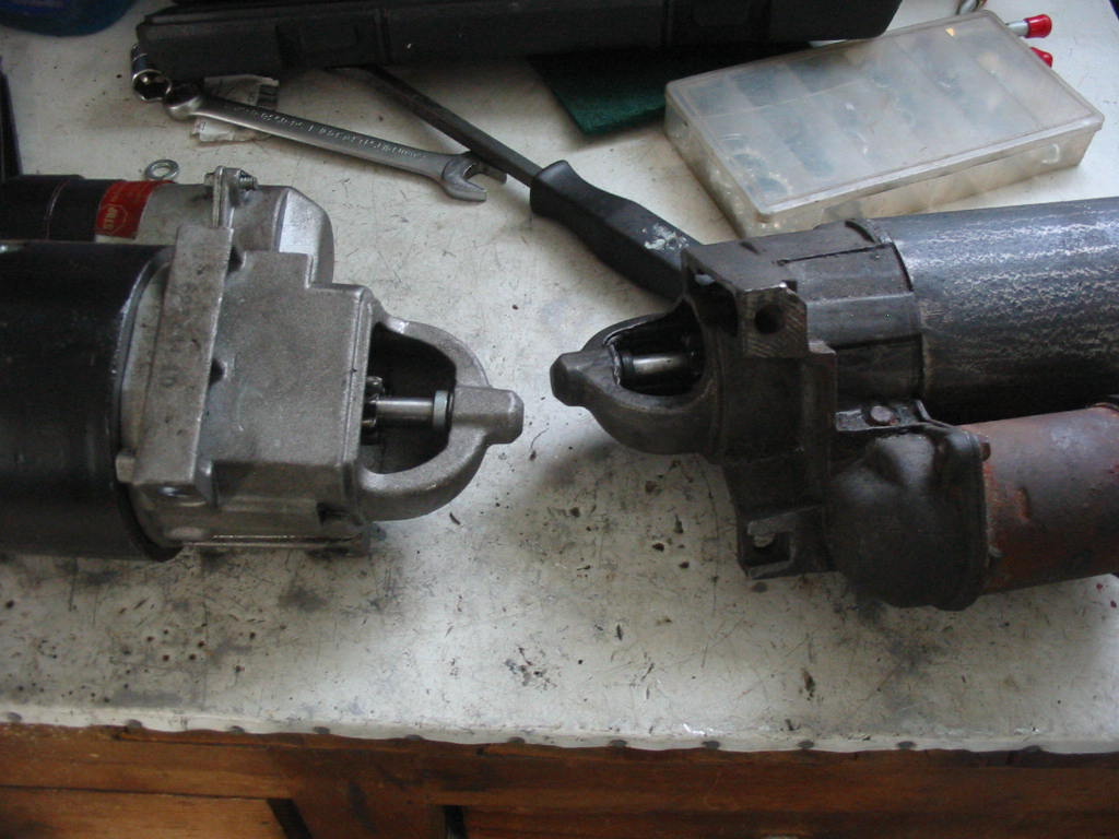 I attempted to fit the new starter from the original Chevy engine (left) only to find out it wouldn’t fit. The old starter from the 305 donor works but the solenoid got damaged when it was removed.