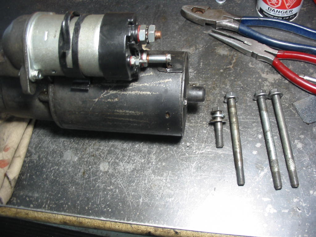 Fortunately the solenoid from the newer starter fitted the old 305 starter. Instead of two long bolts the 305 starter takes a short and long bolt (left). The newer starter bolts are also a bit longer.