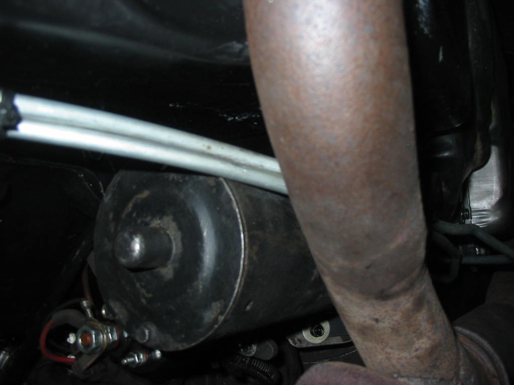Starter in place with two mounting bolts. All it needs now is the support bracket from the back of the starter to the block. A tight fit, but just enough room to slip it in between the block, exhaust pipe and trans lines.