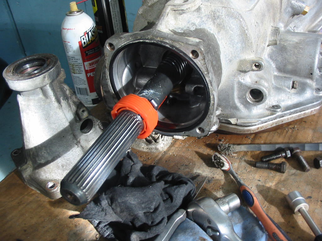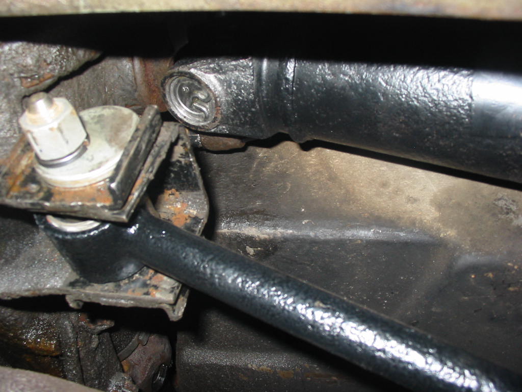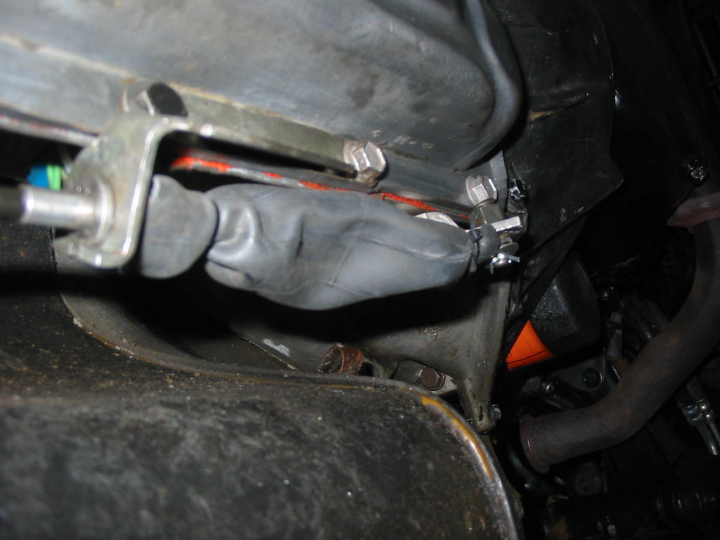 Next job was to connect the shift cable to the trans. The original rubber cover was rotted out. I couldn’t find a vendor that sells new ones. I would need to buy a whole new cable setup to get the rubber! So instead I used a length of bicycle inner tube. I put the shift in park which moved the cable to it’s full length and then cut a length of tubing that was a bit longer and fastened it on with cable ties.Seems to work OK and it will keep road grit out of the cable housing. Note the photo is looking up at the bottom of the trans.