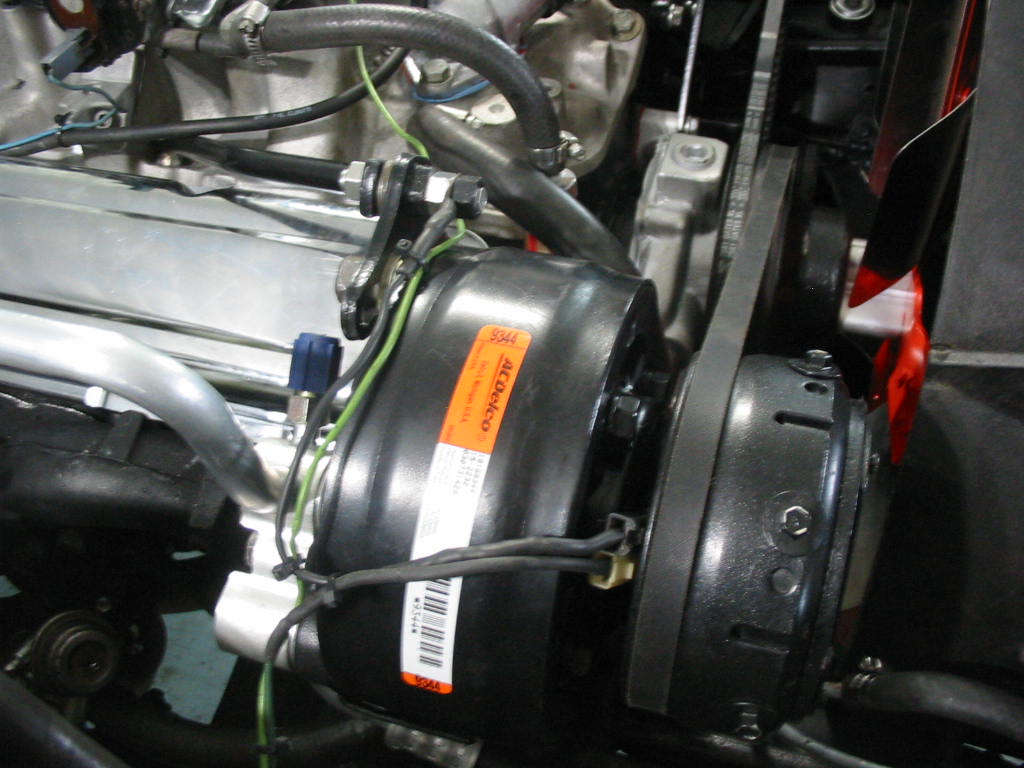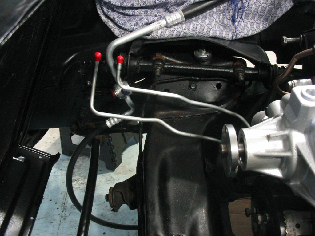 I had to add a 90 degree fitting to the high side of the AC line so that it will clear the hood. I need to do the same with the low side fitting (blue) so that I can connect the AC gauges to charge the system. That part should arrive today I hope.
