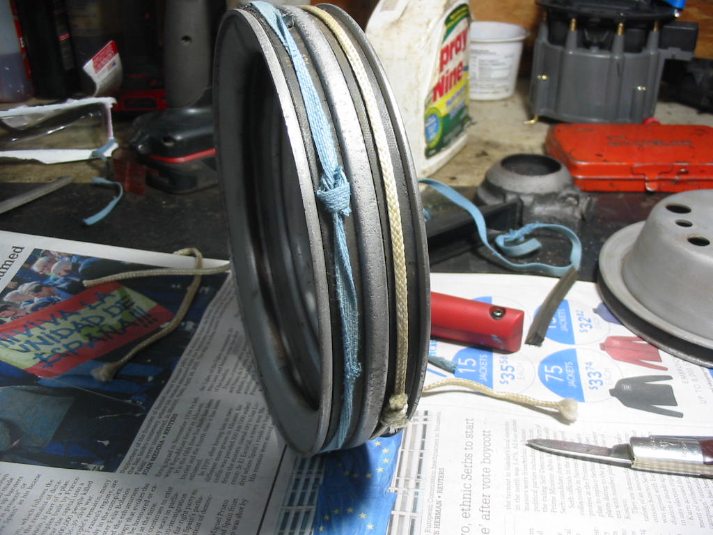 Getting the pulleys read for painting. I’ve cut lengths of V belt and held them in place with string. I painted the inside of the V slots in the pulleys before on a 360 Dodge engine. The belts tended to slip and squeal when reving the engine. It was hard sanding off the paint after.