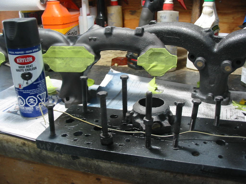 Exhaust manifold bolts and manifolds ready for paint. I’m using barbecue high heat paint. It’s good for sustained temperatures of 600 or so degrees and bursts as high as 1200 degrees. It doesn’t need to be heat cured so we’ll have to see how good it works.