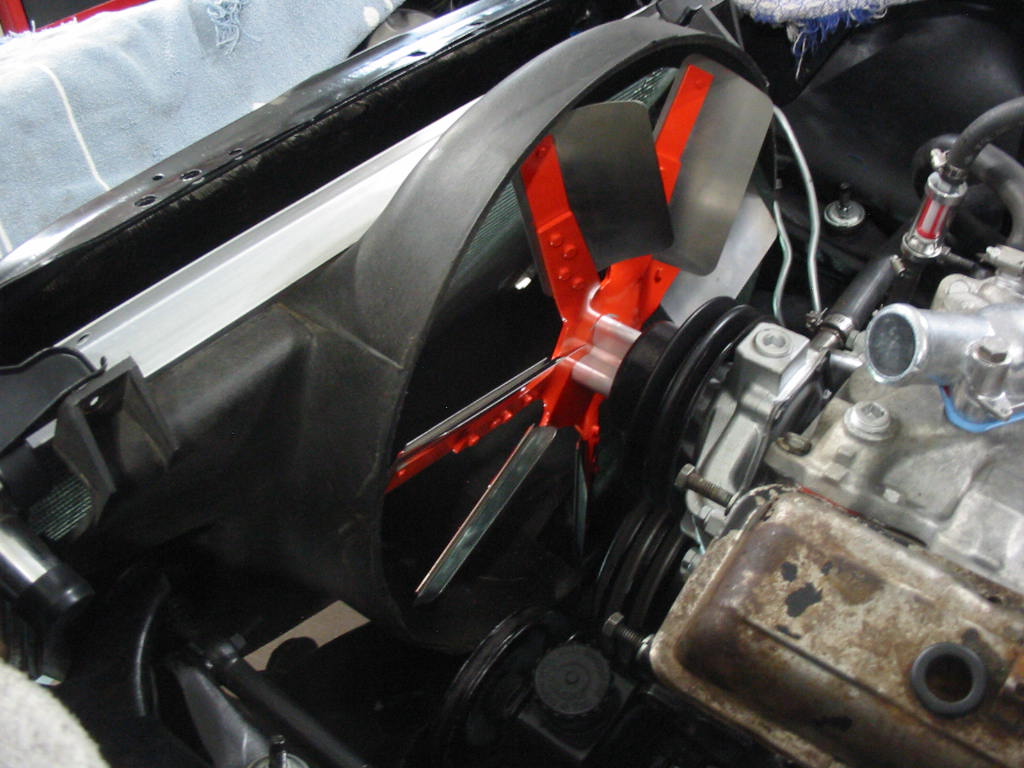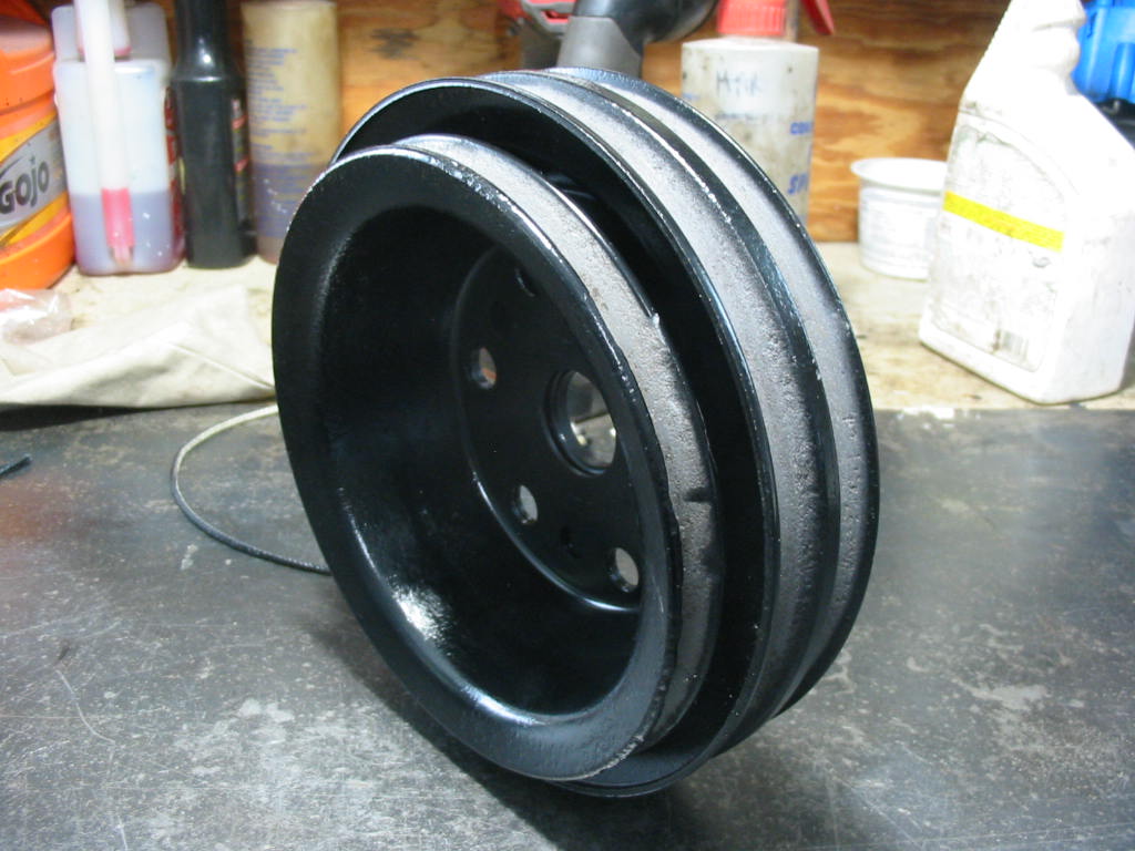 The rad had to come out again before I could get the shroud in place. It’s also the best time to install the fan pulley and fan. I’m going with a flex fan as they use less HP at speed and provide good air movement at idle. I’ve read you can gain 5 hp with them. That would cover the loss from the AC. I’ve yet to sand the fan pulley. I’ll use a short length of V belt and course sand paper to clear out the grooves.