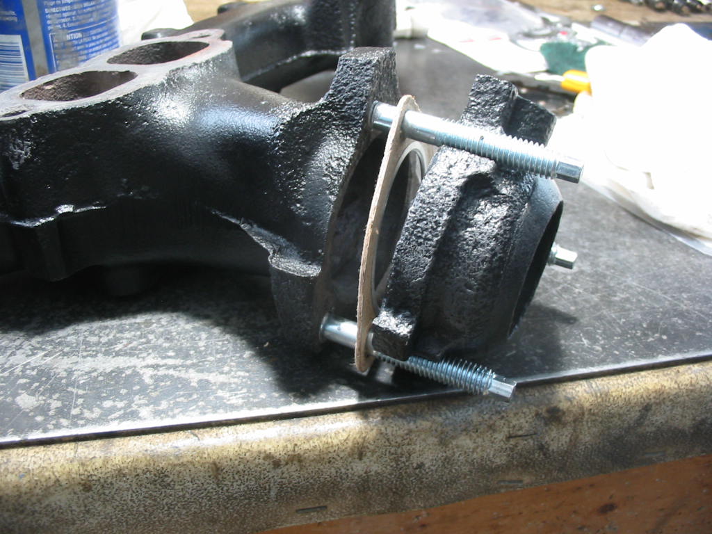 Time to install the new left side manifold. This is how the spacer will go back into the car. The spacer held the original flapper that channelled exhaust gases under the intake for cold start ups.