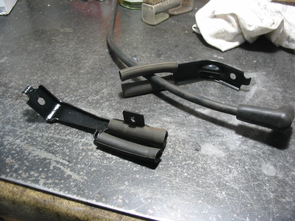 Cleaning up the plug wire guides that fit on the block behind the heads and lead the wires towards the back plugs and the wire shields for the front plugs. Same routine of scraping, cleaning, sand blasting and paint…