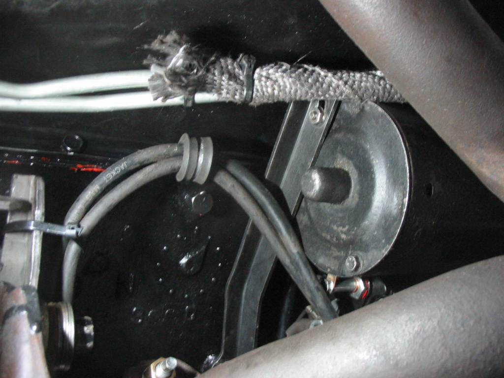 I was able to get the wire shield installed on the left side, but with the 305 starter and bracket in place it was impossible to get the shield on the right side. So I mounted a cushioned bracket to a pan bolt and ran the #2 &4 wires away from the exhaust system. I’ve also wrapped the transmission lines with header insulating wrap where they run near the exhaust pipe.