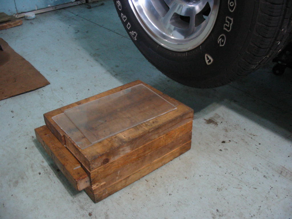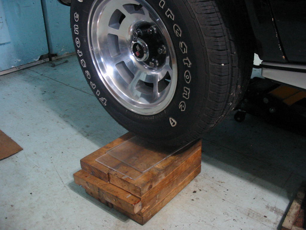 Time to tighten the rear struts. They have new bushings and need to be torqued while the weight is on the wheels. I’ve put a couple of layers of hard plastic on top of the wood blocks. This should allow the wheels to spread out and put the suspension on its lowest level.