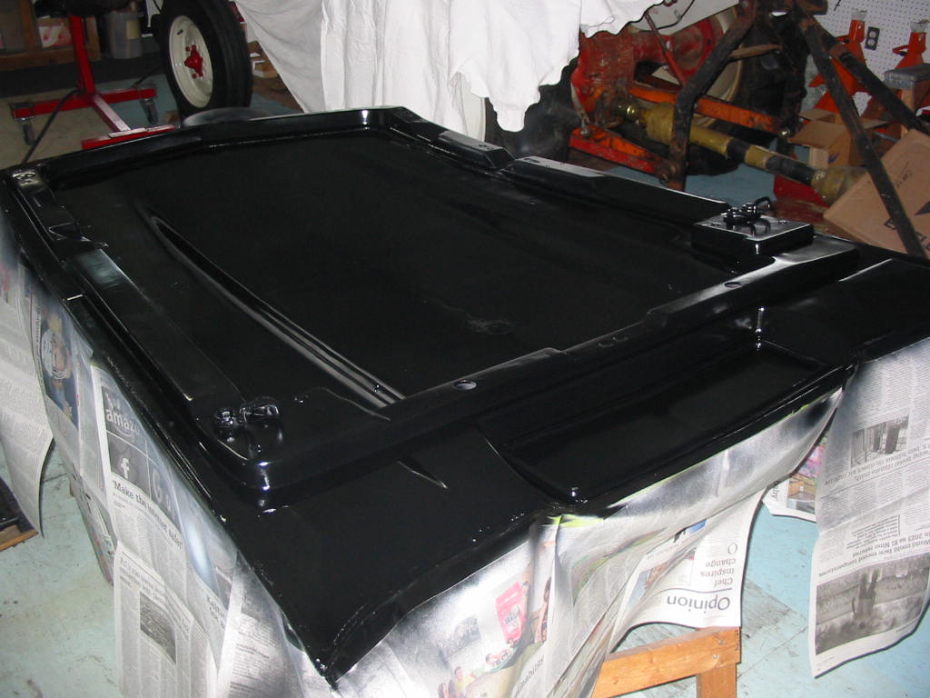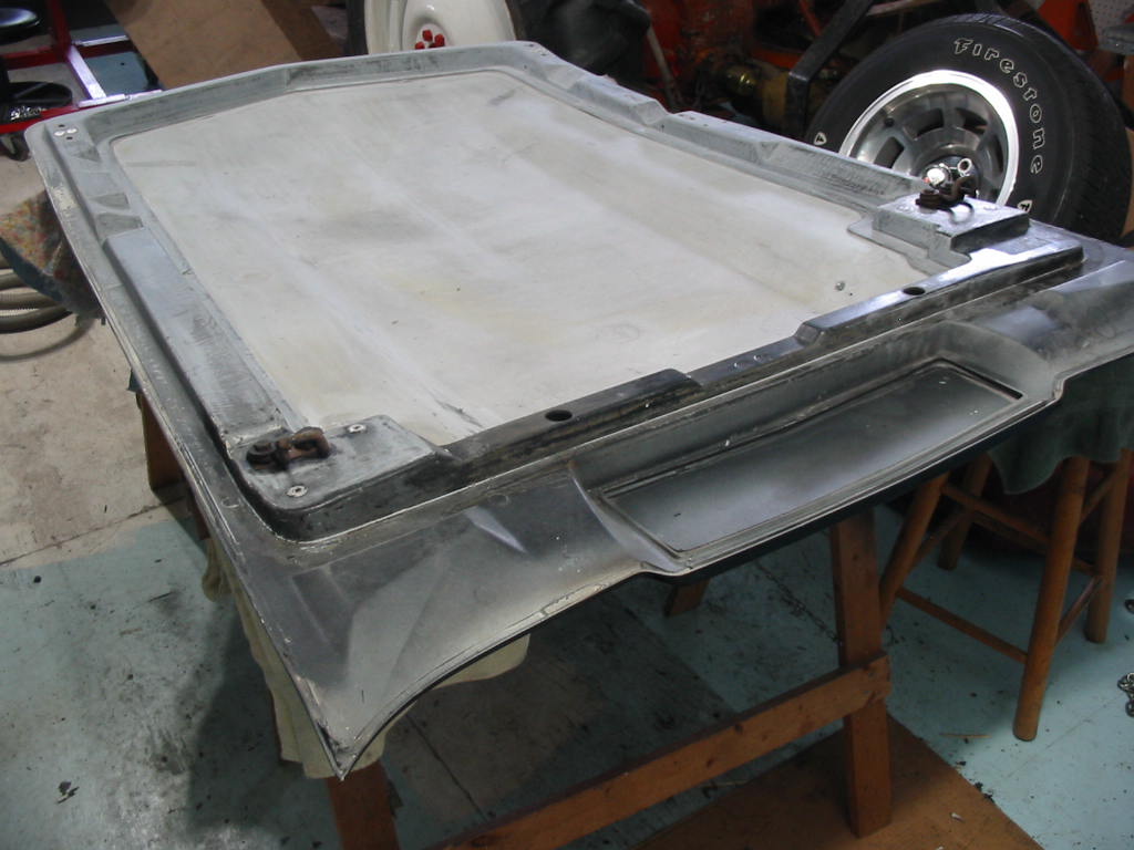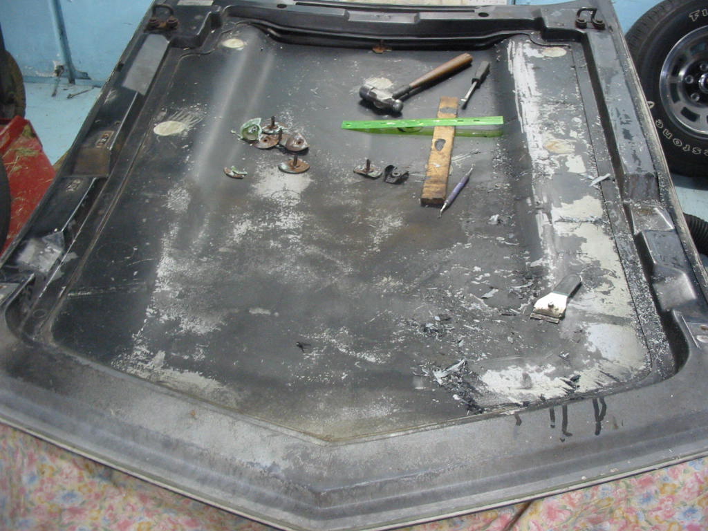 Not a fun job, but the hood needed to be cleaned up and painted. I’ve removed the sound mat attaching posts. I’ll just paint it this time and next time I’ll put on some stick-on sound deadening when I’m doing the interior floors.