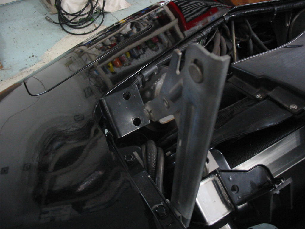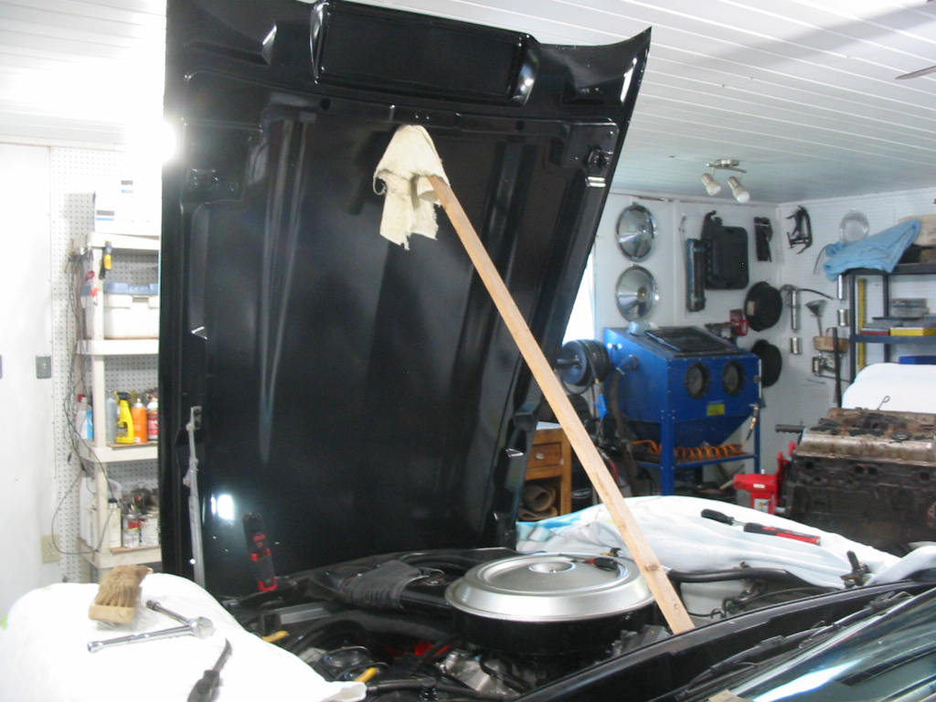 Getting the newly painted hood back in place. I had to use this setup to allow the hood support on the left side to be loose so that I could adjust the left side hinge. After some fiddling I was able to get the hood fitted OK.