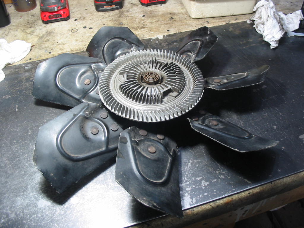 One of the problems with the last test drive was a very loud whirring noise from the engine that got louder as the rpm increased. I’m thinking it is the flex fan which surprises me since I have used them in the past and they have tended to reduce noise. Anyway I’m going to install the old fan and see if that makes a difference. I’ve cleaned it up a bit, but I’m not sure that the fan clutch is working OK. It does have some resistance, but there was signs of oil on the shaft.