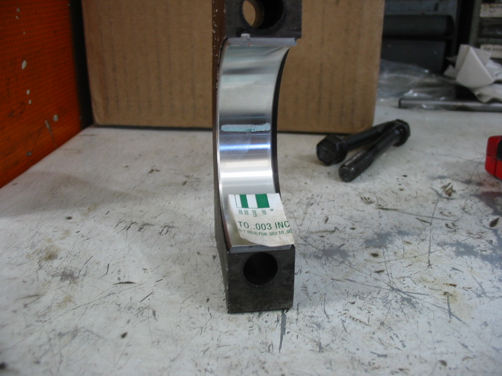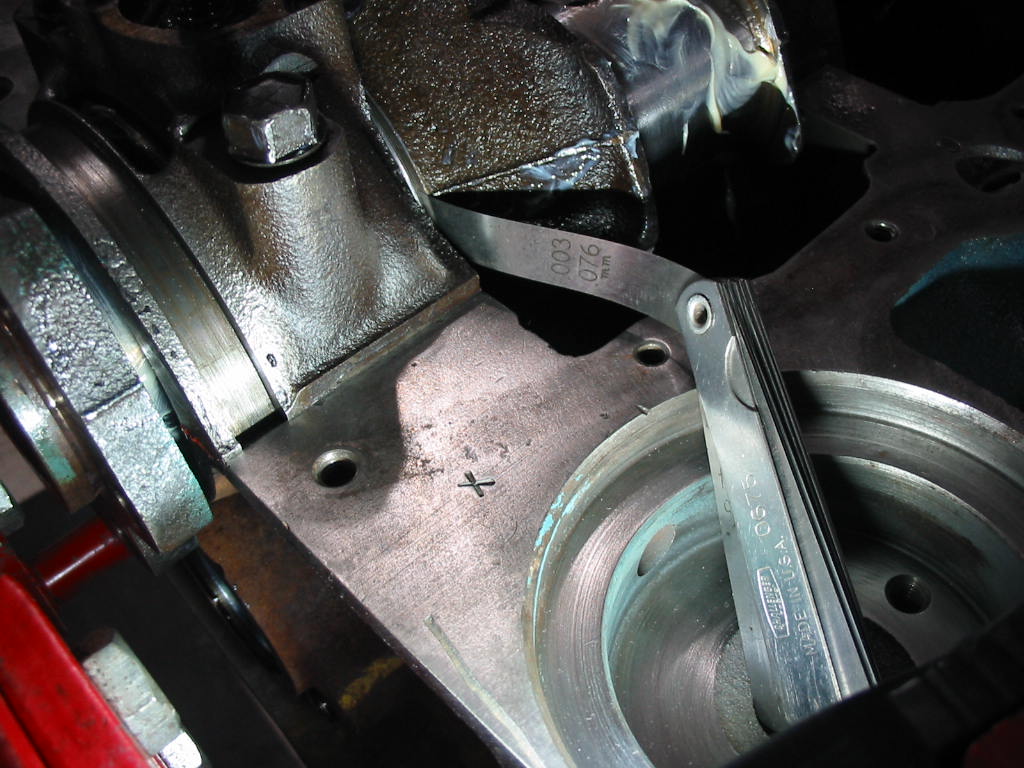 With the main caps in place it was time to check the crank end play. I moved the crank back and forth with a rubber dead blow hammer and then did the check. The clearance wasn’t even all the way around. I got measurements between 0.002 and 0.003 where I could get the feeler gauges in. So within spec of 0.002 and 0.006.
