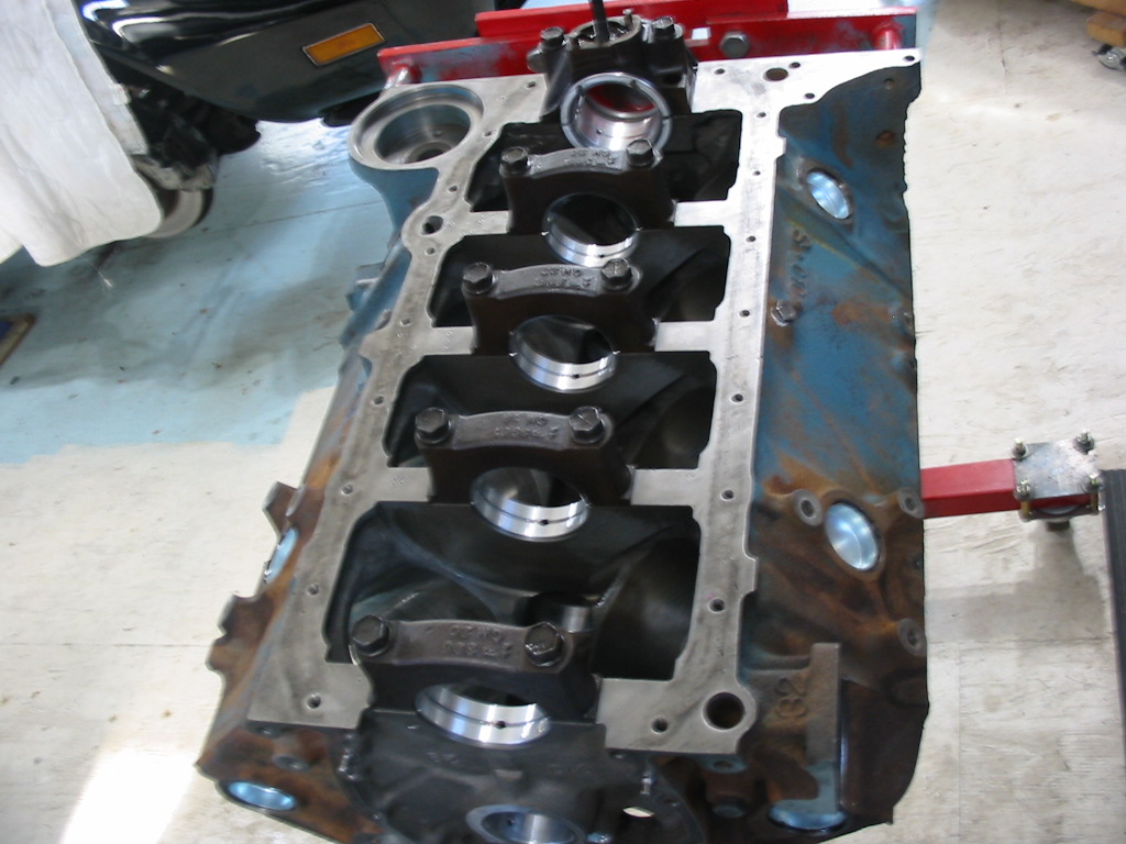 Crank in place with a dab of red sealant on the ends of the rear seal. I may have overdone it a bit. Likely should have only put it on one side. Hopefully it won’t come back to bite me and I end up having to replace the seal with the engine in the car. I’ve done it before. Not too hard, just a bit messy and a bother.