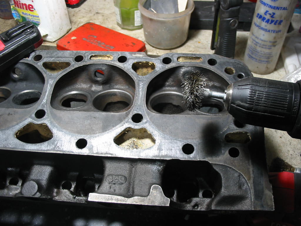 Here I’m cleaning up the combustion chambers with a brass wire wheel so as to not damage the valve contact surfaces. There wasn’t much carbon residue.