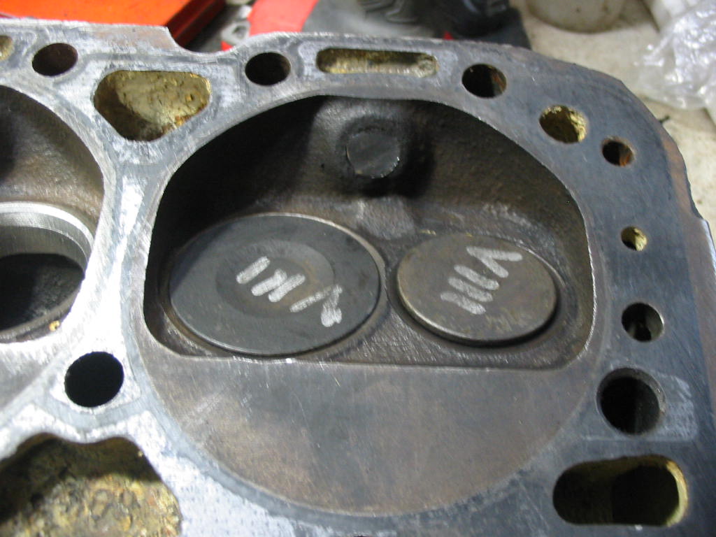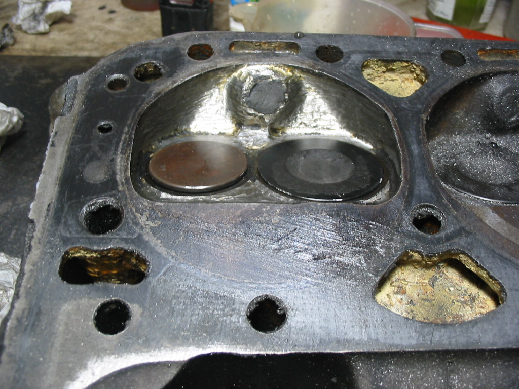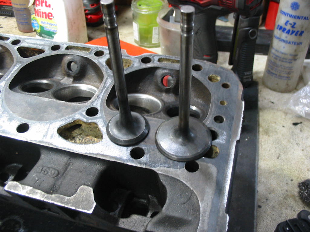 After cleaning the combustion chambers, including the valve openings, I cleaned up each of the valves on a wire wheel – being careful not to hit the valve/head contact surface. the exhaust valves were fairly clean, but the intakes had significant carbon deposits. May have been the result of poor valve seals on the intakes.