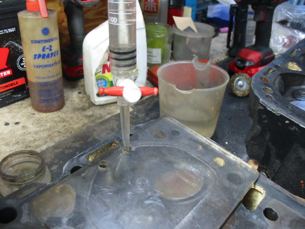 I picked up a pipette from Amazon some years back. It is marked off in ccs. I fill it to the top (0 cc) and then fill the combustion chamber. I fill it until the two holes are filled to the top and all the air is out of the chamber. I’m looking for an even combustion chamber volume. t The little extra water in the two fill holes will give me a slightly higher reading, but it will be the same for all cylinders. The final number may be a bit off, but they will all be the same and it’s the evenness that counts.